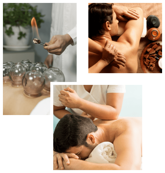 - Cupping (where a cup is applied to the skin, and the pressure in the cup is decreased, drawing the skin and muscles up into the cup).